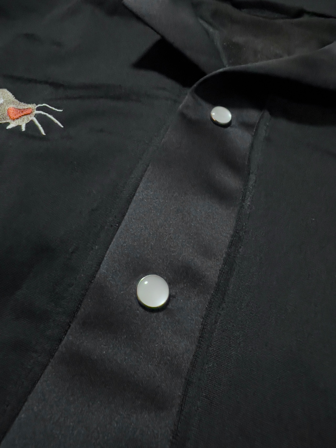 襟やカフス、裾のディテールにはマットな黒のサテンを切り替え、
