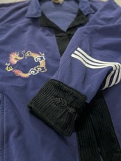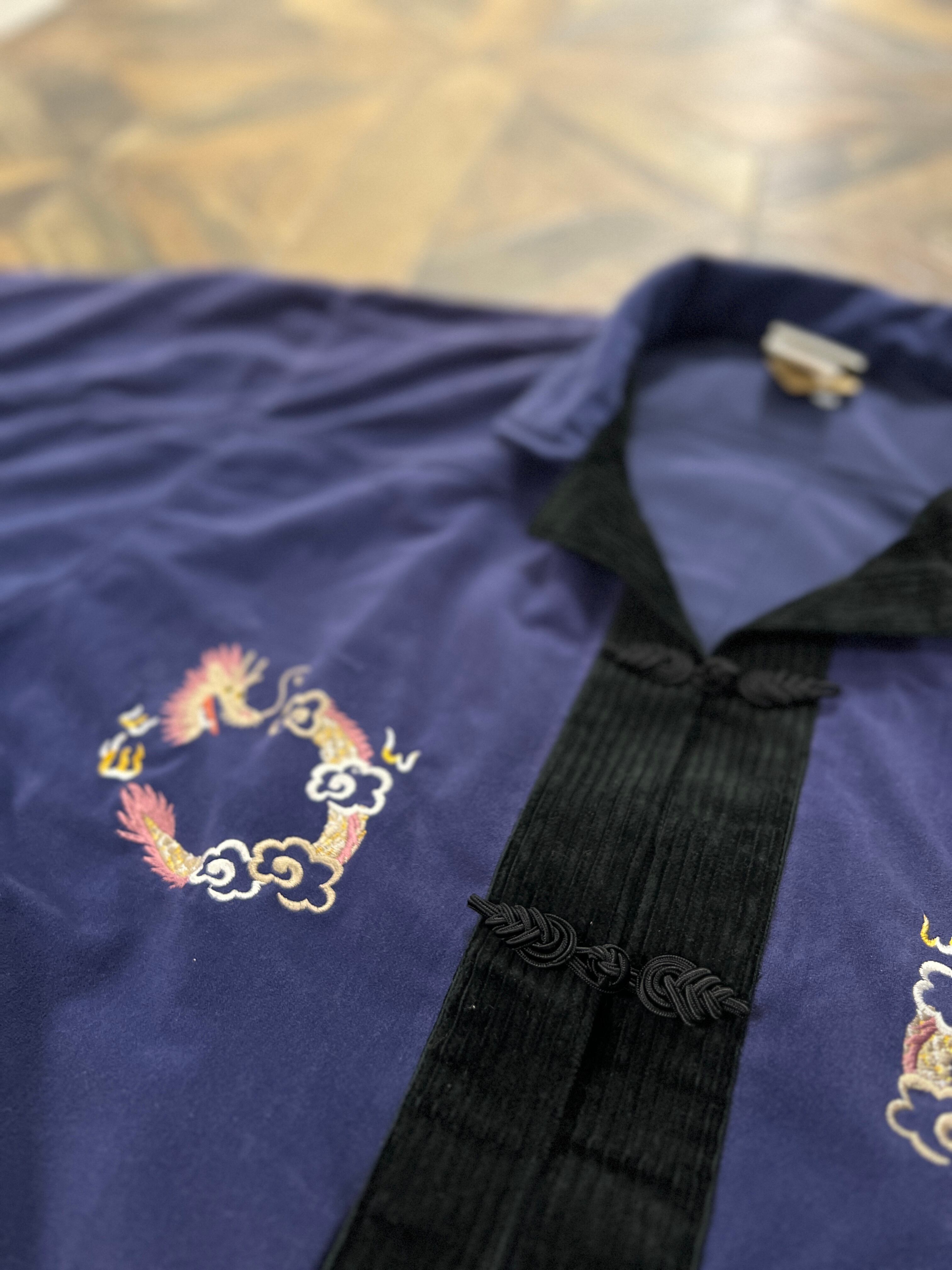ネイビーベロアに施した龍の刺繍は、戦後日本のスーベニアジャケット(スカジャン)に着想を得たモチーフ。