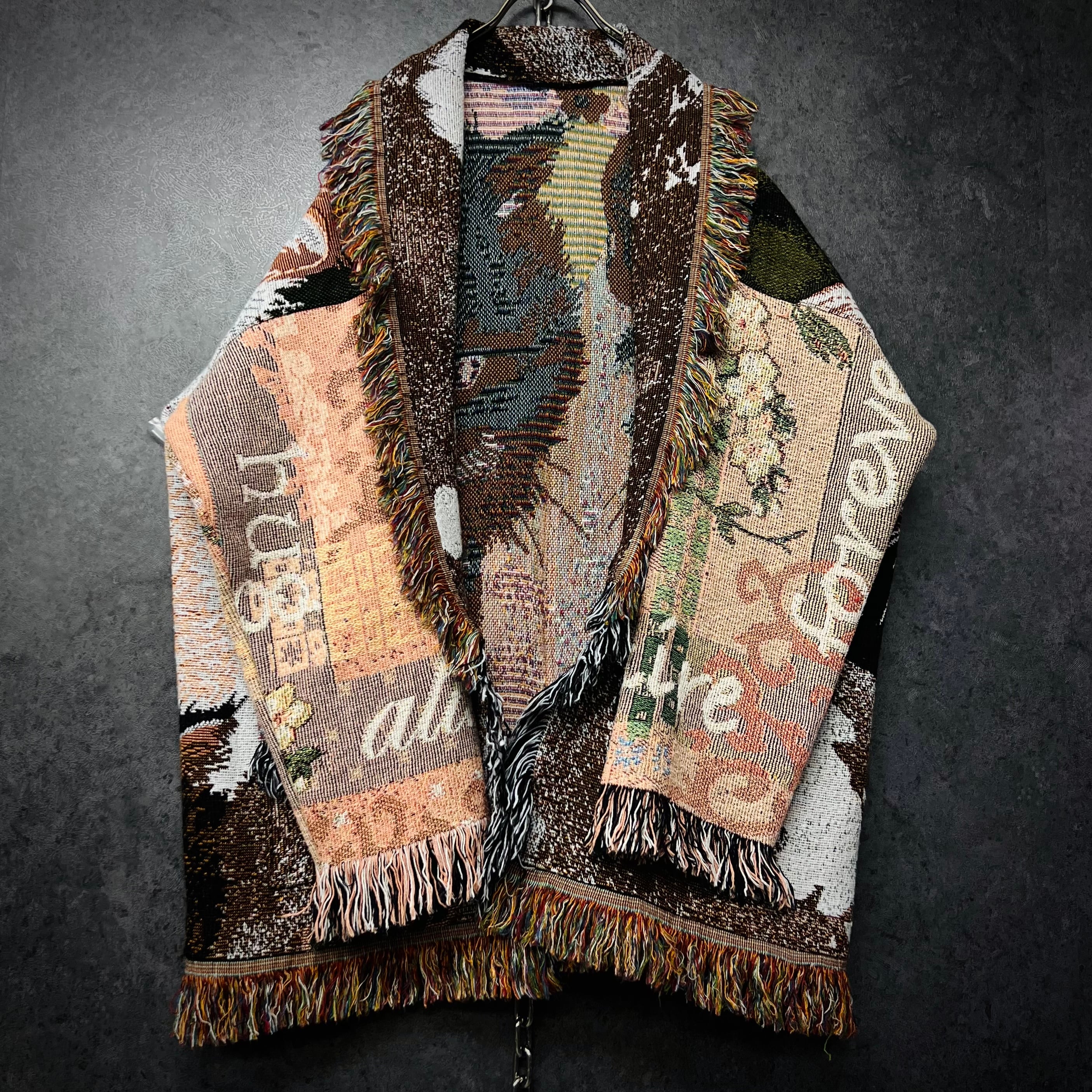 [Original] vintage fringe rug/blanket Jacket "cats"