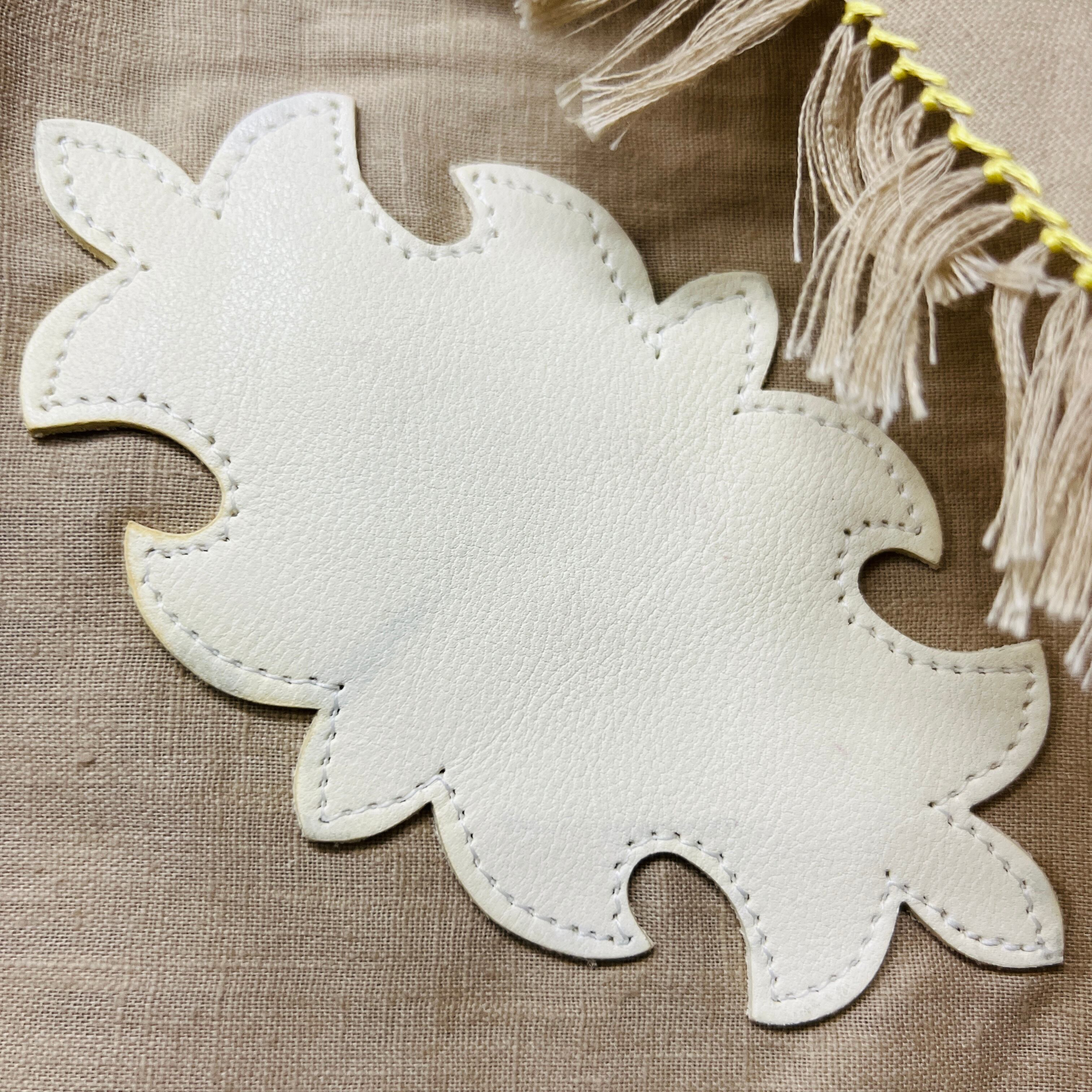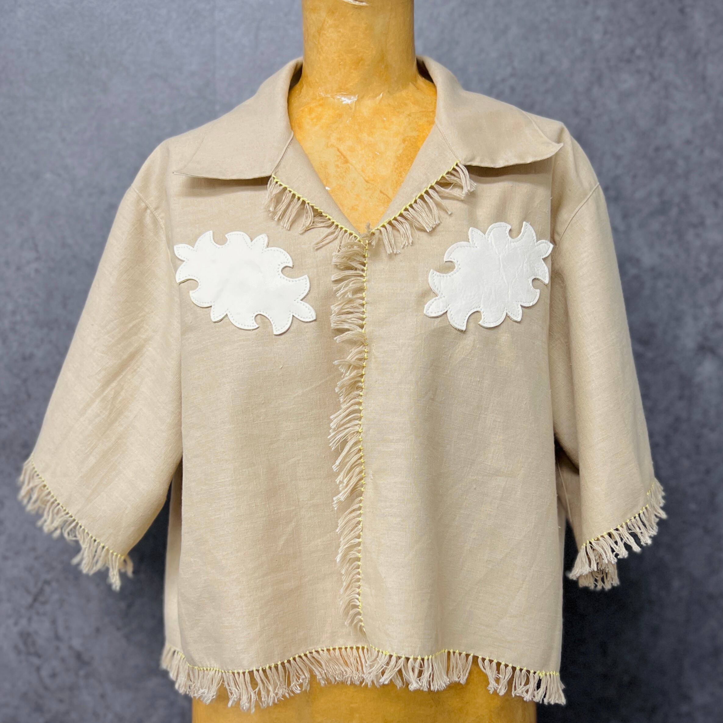 ぐるりとフリンジ入りで、胸のウエスタンモチーフのレザーワッペンがポイントのオープンカラーシャツ。