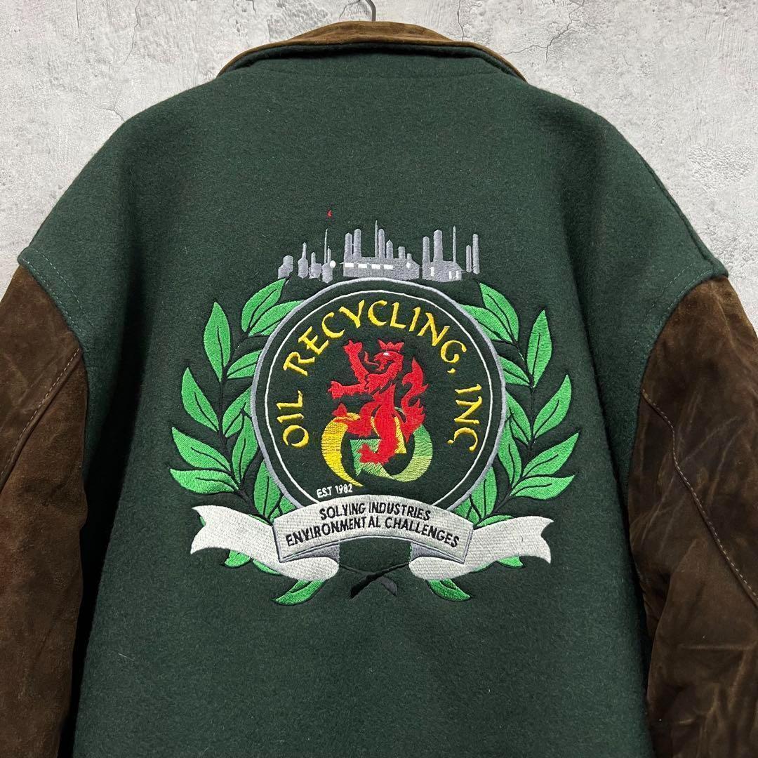 US古着 スエード レザー 本革 スタジャン/ブルゾン ウール 中綿キルティング 企業 刺繍ロゴ ブラウン グリーン