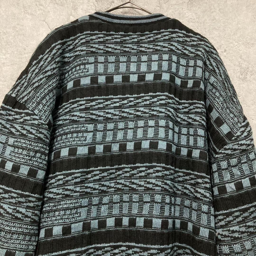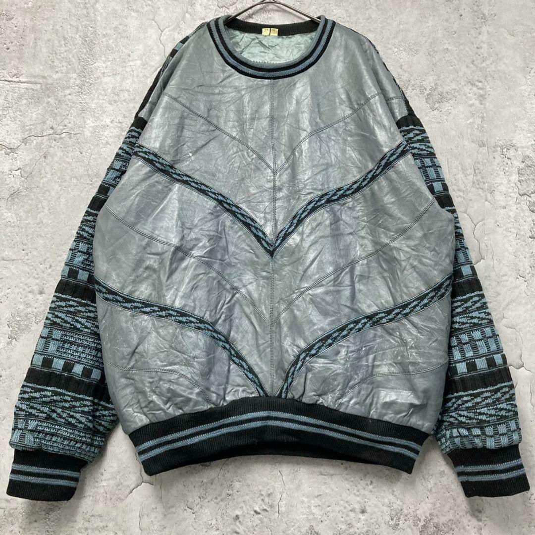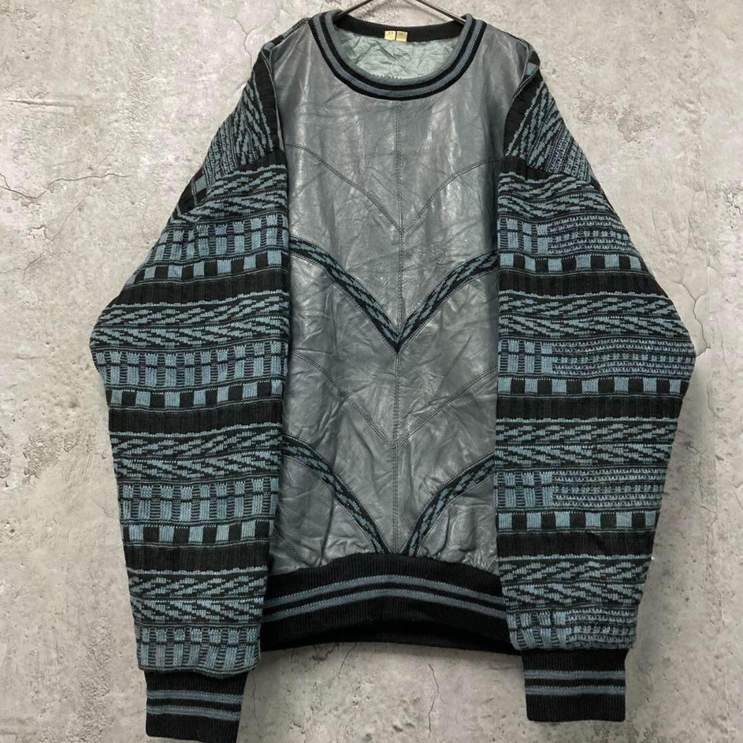 US古着 ニット × レザー 総柄 ボーダー デザイン セーター